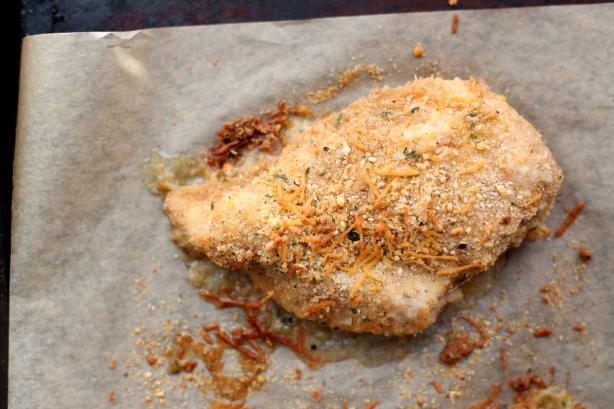 O...M...G. This was SO good. I have to admit, since I'm not much of a chicken person, I wasn't exactly looking forward to having this. (The rest of the family loves chicken.) However, I absolutely LOVED it. I went back for seconds! I only changed it up slightly, due to some of the other reviews. For starters, I sliced my chicken breasts in half, so that they were thinner, hence allowing them to cook more evenly. I then used panko bread crumbs, to make them a bit crispier. Lastly, since a few people said that the breasts were a bit mushy on the bottom, I used a round pizza pan with holes in it. It worked perfectly. (I sprayed it with PAM.) I was nervous as these were baking, because they house smelled REALLY garlicky, however, I thought the amount of garlic was perfect and didn't taste overwhelming at all. The rest of the family raved about it, as well. THANK YOU Kittencal for the excellent recipe!