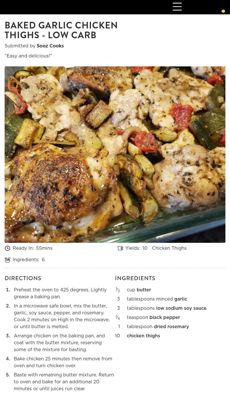 Excellent dish! Quick, easy, delicious! I’m calling this my “Self-isolation Supper”! I didn’t use the EXACT ingredients because I’m obviously avoiding unnecessary supermarket visits due to current circumstances, but it turned out wonderfully- which shows the versatility of this recipe. I used one package skin-on bone-in thighs and one package of boneless skinless thighs- about 9 pieces total. I didn’t have rosemary so I used my Italian seasoning that has a bit of rosemary in the blend. I followed the directions as given but, when it came time to turn and baste, I decided to add some leftover grilled vegetables (zucchini and cherry tomatoes) so I nestled them between the chicken pieces and finished off the baking. It was absolutely wonderful and we will definitely be making this on the regular even after isolation is over. Thanks for sharing this fantastic recipe! (Photo uploaded)