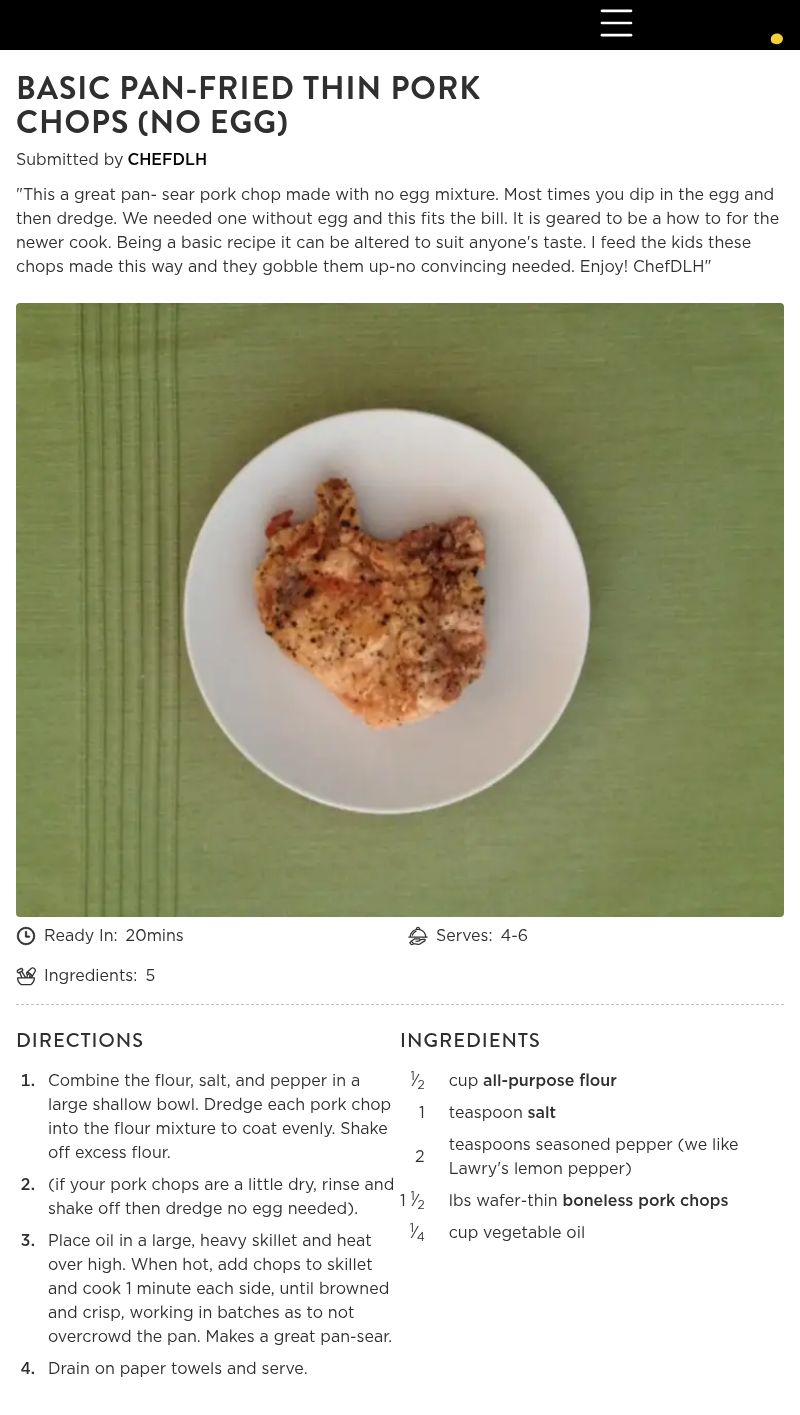 I've made these for years and they'rey husband's favorite way to eat pork chops. I simplify by putting the flour and seasoning (just salt, black pepper, and a little garlic powder) in a large zipper bag. I mix well, then drop in the damp chops and toss vto coat well. After all chops are done I put them in a warm oven to hold while I make a pan full of creamed gravy, which we like with the chops, rice or mashed potatoes, and bread or biscuits. Umm, umm!