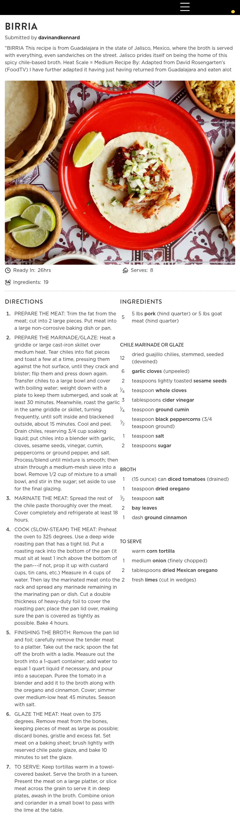 1. Okay, so it is a lot of steps and a lot of work BUT it was worth all of the effort! The end result was amazing. Seriously the best birria I've ever eaten. It made a lot so I'm going to make quesabirria tacos with the leftovers! Can't wait!
