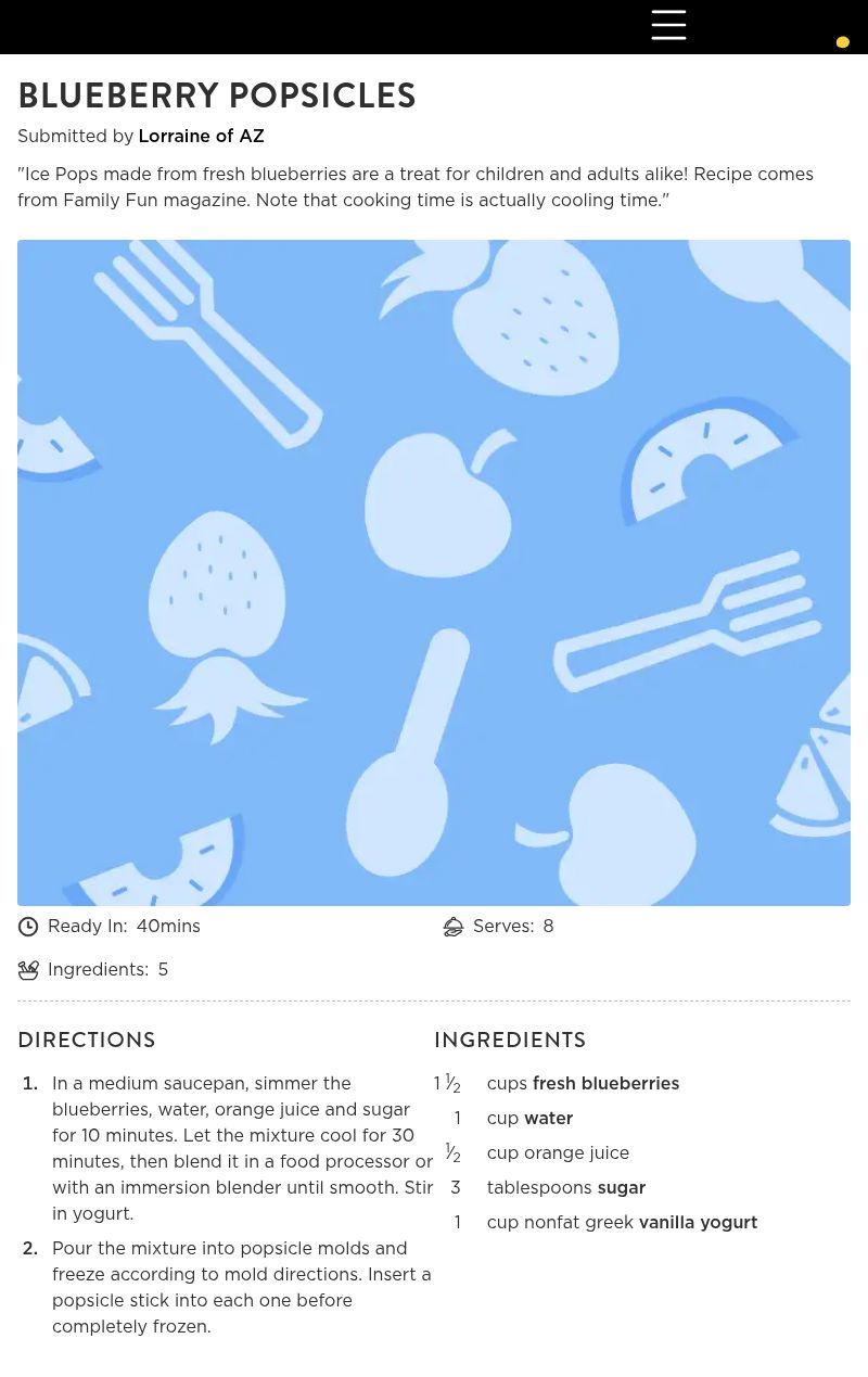 - In a medium saucepan, simmer the blueberries, water, orange juice and sugar for 10 minutes. Let the mixture cool for 30 minutes, then blend it in a food processor or with an immersion blender until smooth. Stir in yogurt.