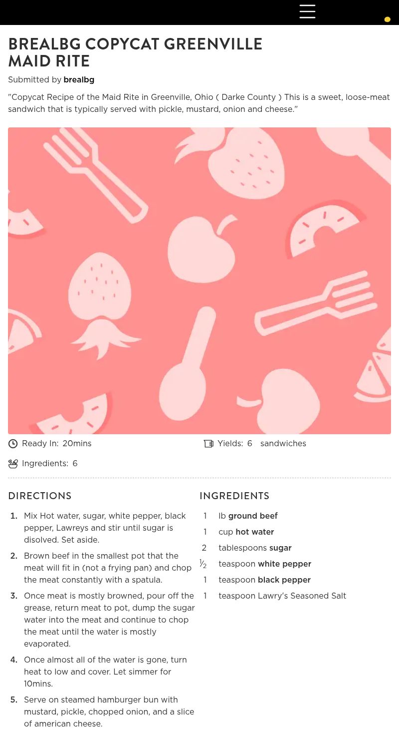 "Copycat Recipe of the Maid Rite in Greenville, Ohio ( Darke County ) This is a sweet, loose-meat sandwich that is typically served with pickle, mustard, onion and cheese."