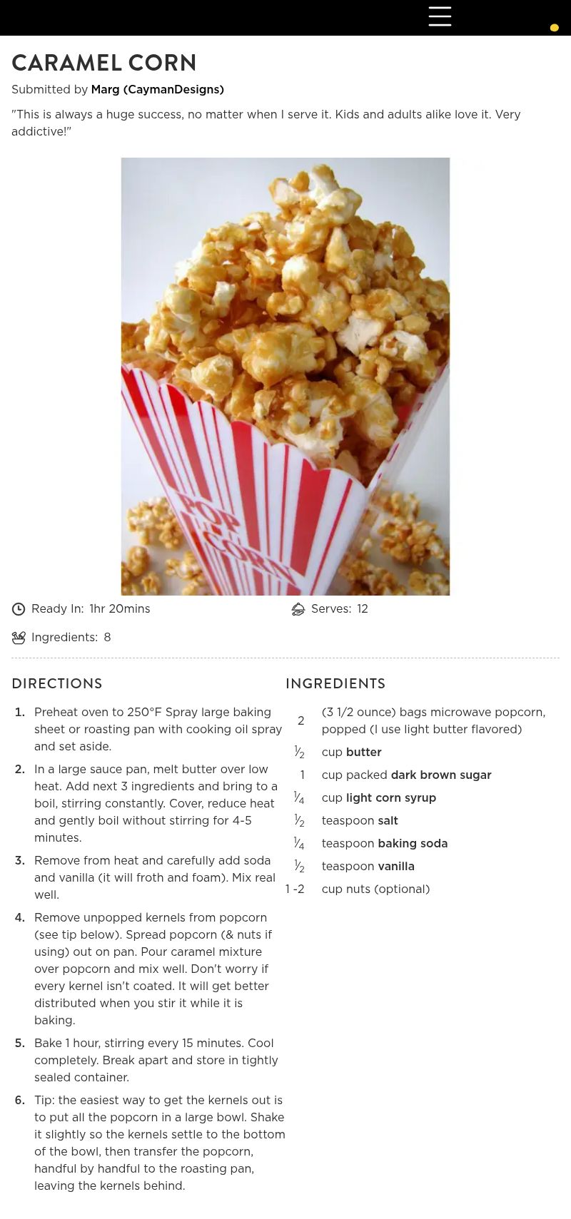 - Remove unpopped kernels from popcorn (see tip below). Spread popcorn (& nuts if using) out on pan. Pour caramel mixture over popcorn and mix well. Don't worry if every kernel isn't coated. It will get better distributed when you stir it while it is baking.
