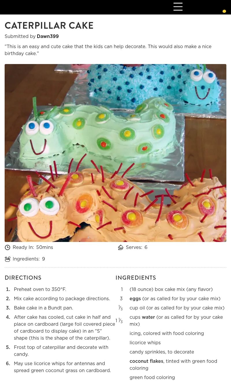 Thank you for posting this wonderful and fun idea. My son loved his cake and everyone was amazed that I was able to produce such a lovely caterpillar. I used sour strips for the stripes and mouth and marshmallows and M&M's for the eyes. I used a pound cake for the cake mix and it turned out very tasty as well as cute. Thanks again Dawn!