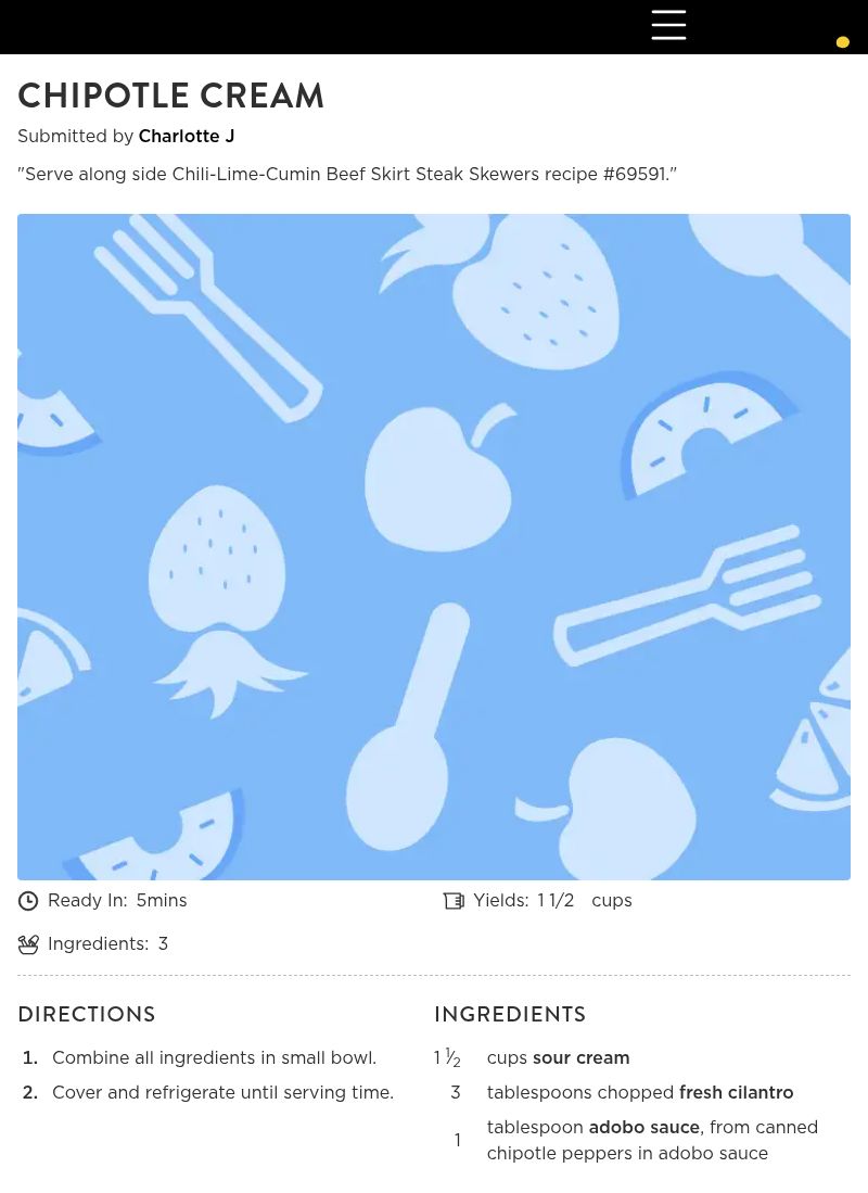 2. This was a good start, to about 1 cup of sour cream, I added one chipotle pepper in adobo sauce, a large clove of garlic, lime juice and zest. This makes a great taste combination. (I used this combined with fresh salsa that had cilantro in it so I didn't want to add any extra. ) I sizzzed everything together with my immersion blender. I served this with Recipe #360762. Thanks for sharing, reviewd for ZWT 5 by one of the Cooks With Dirty Faces.