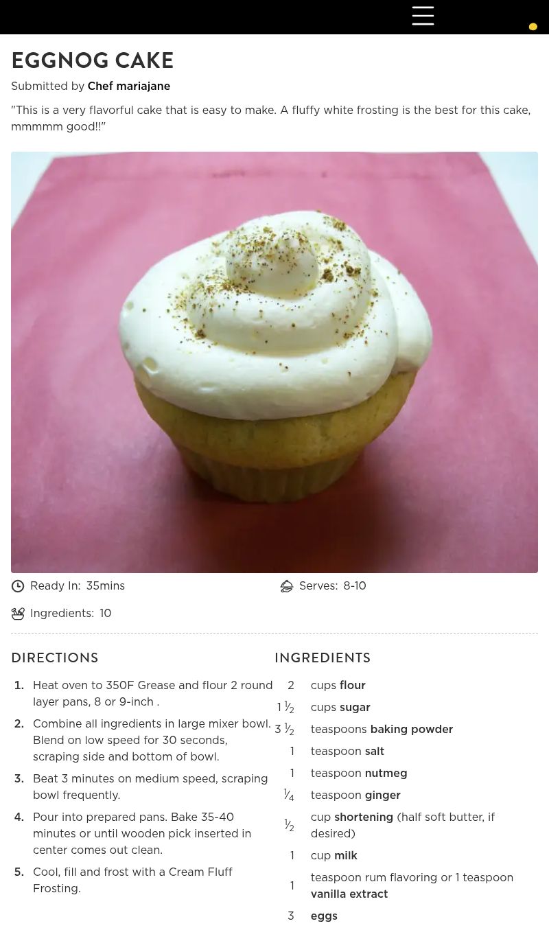 I've died and gone to Holiday Heaven! I love the holiday season and look forward to this time of the year because of the spices and the pumpkin and eggnog flavors that come out. I love anything eggnog: ice cream, gelato, Starbucks coffee. I once tried an eggnog cake at a party last year so I decided to look for a recipe. There are many different recipes out there and not very many rated. So I tried this one based on ingredients (wanted it from scratch, not from a box). It was so easy because you mix everything all at once. You HAVE TO use the rum extract! It's what makes this cake! It was my first time ever using it but when I first opened the bottle and smelled it I knew that this cake was going to satisfy my eggnog craving. I was quite excited to finally try it. I actually made 12 cupcakes and 24 minis instead of a round cake. I baked the big ones for 20 min and the minis for about 12 min. I don't know what white cream fluff is that the poster suggested so I used my favorite topping: "Never Weep" Whipped Cream #74805 and sprinkled a little pumpkin spice on top of that. Oh my these were soooo good! If you like eggnog flavor you'll love this cake.
