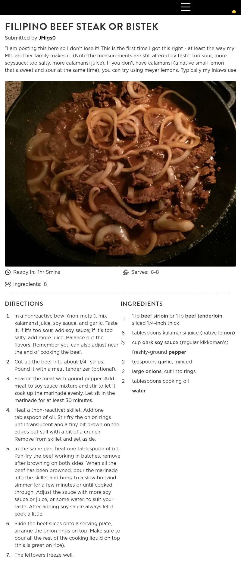 "I am posting this here so I don't lose it! This is the first time I got this right - at least the way my MIL and her family makes it. (Note the measurements are still altered by taste: too sour, more soysauce; too salty, more calamansi juice). If you don't have calamansi (a native small lemon that's sweet and sour at the same time), you can try using meyer lemons. Typically my inlaws use london broil, but you can use any cut. One of the methods used to tenderize the tough cut (yet cheap) cut of meat is to pound it. Another hint on handling the meat: Before you slice it, stick it in the freezer for 15-20 minutes so that it is easier to slice thinly."