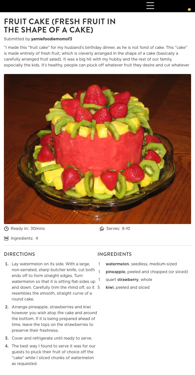 - The best way I found to serve it was for our guests to pluck their fruit of choice off the "cake" while I sliced chunks of watermelon as requested.