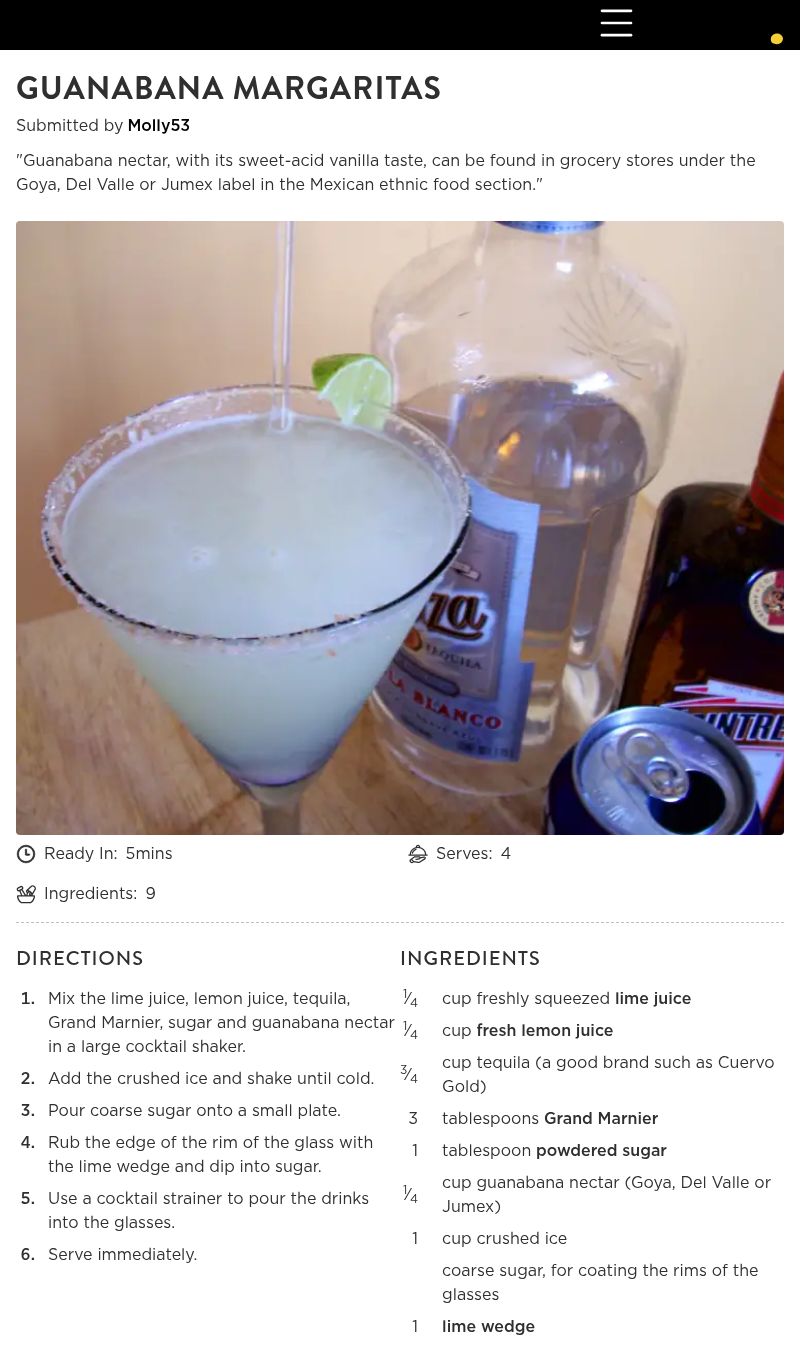 I ended up buying Guayaba (Guava) nectar instead of the Guanabana nectar by mistake. This turned out really good even with my error. I did add some extra nectar to sweeten it up a bit, but I'm sure it is because I used the wrong one. I can't wait to try this using the right nectar! EDIT: I bought some guanabana nectar and made these margaritas....OUTSTANDING! I had never tried this nectar before and I loved it! Thanks for the introduction to this new flavor!