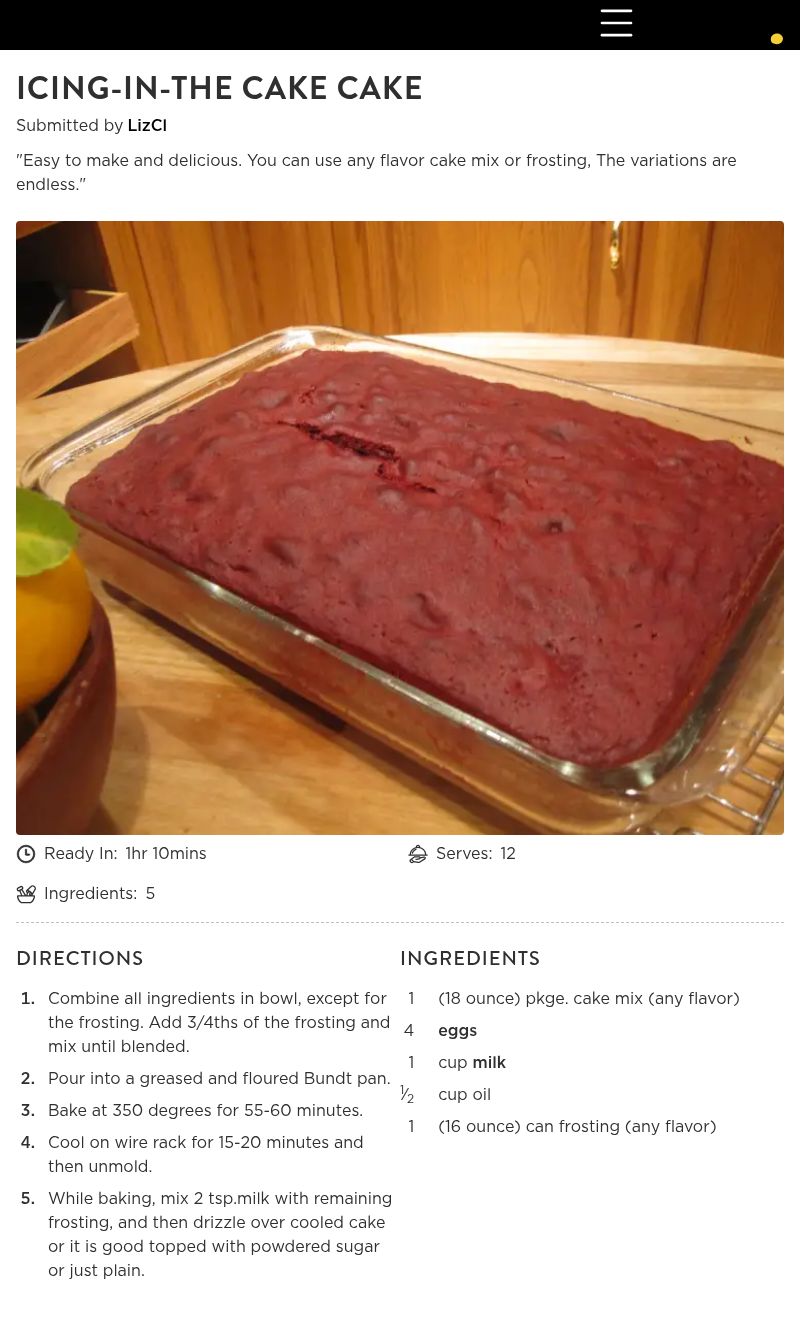 This is such an easy an tasty idea. I used a red velvet mix and cream cheese icing. I saved a bit less than 1/3 of the can for icing the finished cake. It is beautifully moist and has a gorgeous crumb. However, the cake doesn't taste much different than a standard "doctored" cake mix. I opted for a 13x9x2 instead of the bundt called for in the instructions.