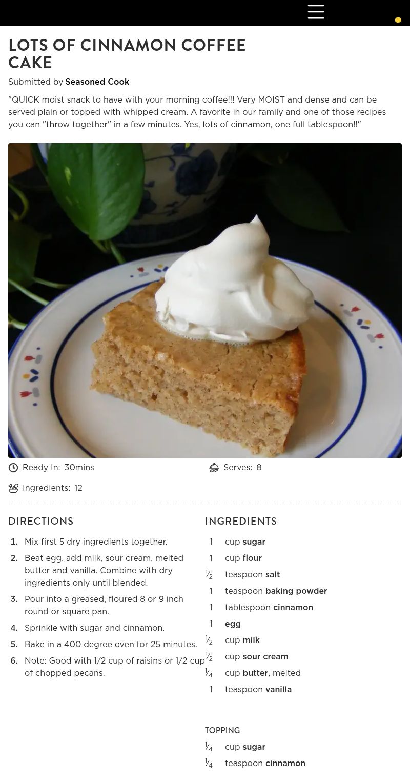 2. This turned out excellent. It was moist and had just enough cinnamon. My husband and I really enjoyed it. I highly recommend this coffee cake. Thanks a bunch!