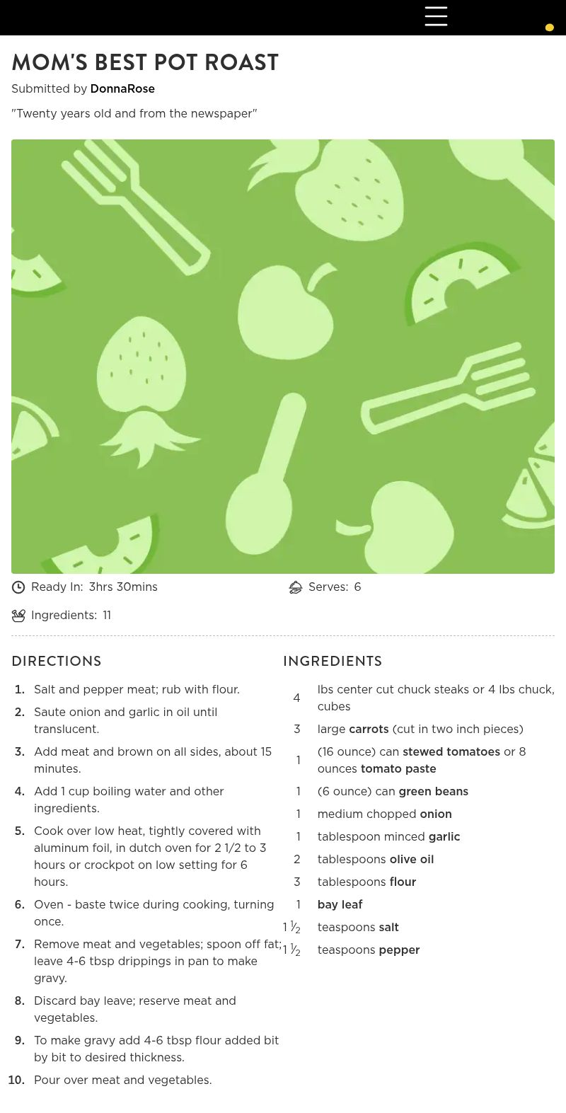 Hi Donna, I've made this pot roast ever since I read the recipe in Working Mother magazine from the January 1985 edition. At that time it was a tiny bit different than yours. It called for 2 tablespoons Kitchen Bouquet and instead of olive oil it called for shortening. I do not use the shortening any more- just the olive oil and I still use the Kitchen Bouquet. Other than these two items, it is exactly the same pot roast. The recipe also included how to make the gravy; perfect mashed potatoes; and deep-dish apple pie.