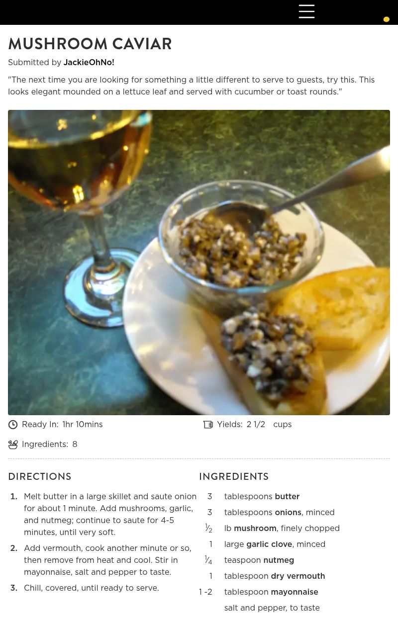 - Melt butter in a large skillet and saute onion for about 1 minute. Add mushrooms, garlic, and nutmeg; continue to saute for 4-5 minutes, until very soft.