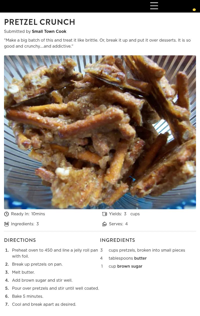 1. I loved the flavor of this, but had a couple of problems. When mixing the sugar and butter, mine was 'tight', like a ball, and didn't coat the pretzels very well. After being in the oven for 5 minutes, I took it out, stirred well, to re-distribute the sugar mixture (which had softened from the heat), and returned to the oven. I repeated this twice, and should have lowered the temperature a little, as some of the sugar was a tad burnt tasting; not bad enough to throw out, but noticeable. I went back and checked to make sure my amounts were right and they were...I'm not sure how to fix this...less sugar? I did pack my brown sugar, as a habit, and perhaps that was my mistake. We enjoyed this anyway, and DS has asked for it a couple of times since I made it. Thanks for sharing, Small Town Cook.