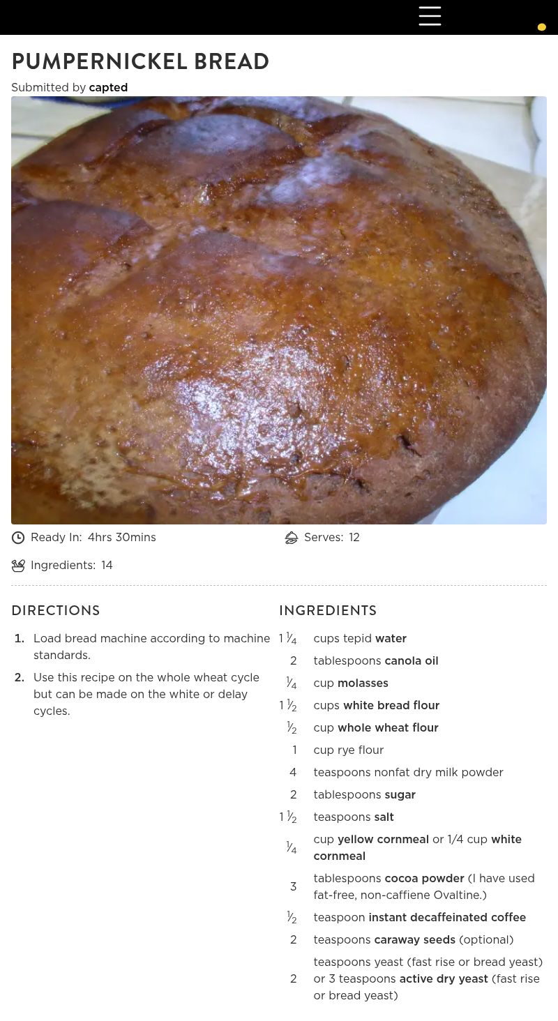 Absolutely the best Pumpernicklel bread I,ve tasted! Bread lasted only a few hours!! (and it was quite a large loaf!!! Beautiful with sliced Gruyere cheese, ham, mustard and sliced tomato! Or just with cottage cheese or even just buttered. I'm about to make my second loaf!!! Also, this bread is good for the constitution!