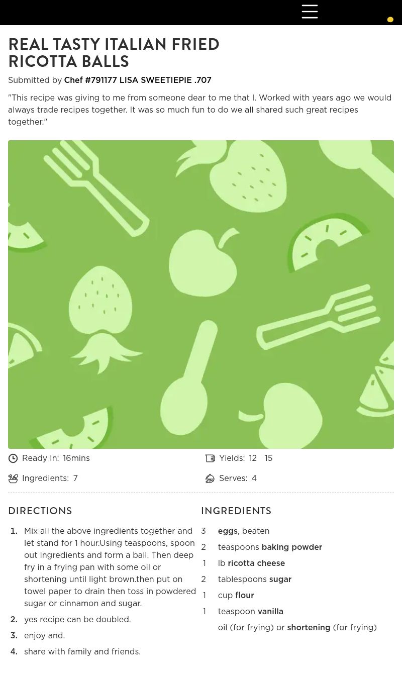 • Mix all the above ingredients together and let stand for 1 hour.Using teaspoons, spoon out ingredients and form a ball. Then deep fry in a frying pan with some oil or shortening until light brown.then put on towel paper to drain then toss in powdered sugar or cinnamon and sugar.