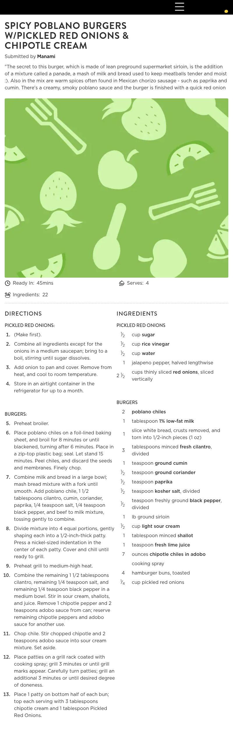 Spicy Poblano Burgers W/Pickled Red Onions & Chipotle Cream