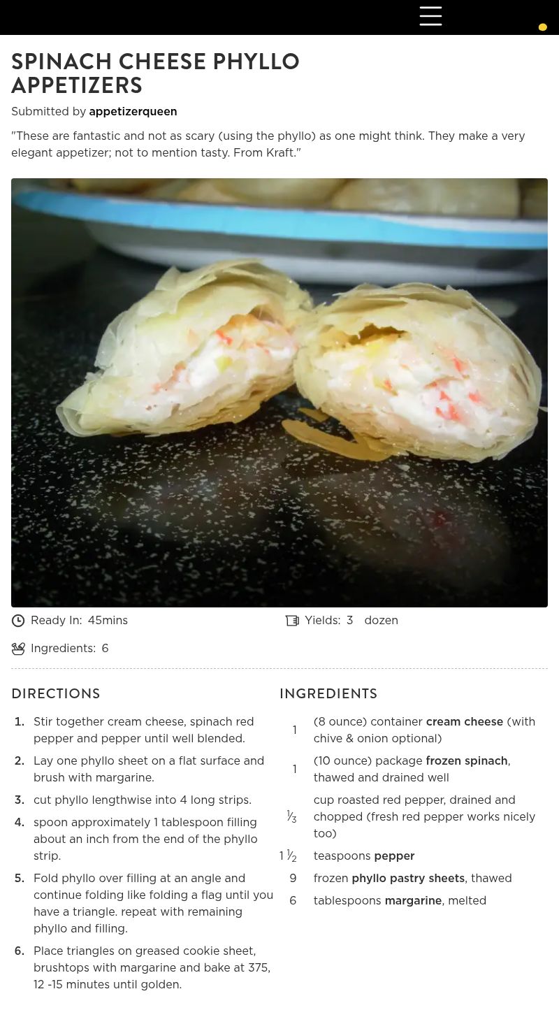 2. The recipe turned out better than expected however I did add two small cloves of garlic, and used fresh red bell pepper (cubed). Since this was my first time using phyllo I was dissappointed that there were not better instructions on how to wrap the darn things. Unfortunatley, I had pictured creating individual wraps and so as I began spooning little mounds onto the dough I was quite confused as to where the triangle should form. 15 lopsided, square, round, and oblong shapes later...they still tasted good :) As for the aesthetics...next time, I'm watching video!
