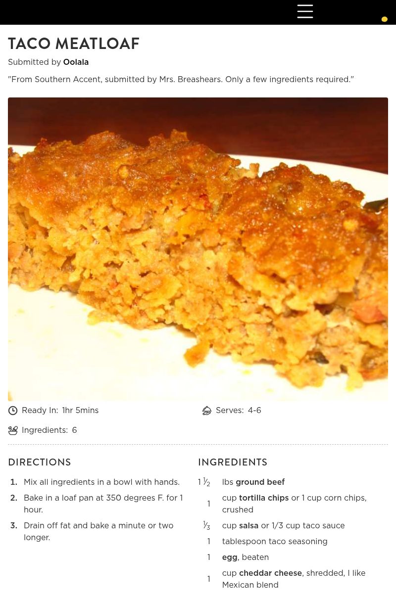 Came across this taco style recipe looking for a basic meatloaf one and just knew I had to try it out. <br/><br/>Me and my brother loved it, didn't even miss Mom's meat loaf one bit...well maybe a little but this will definitely do. Great for sandwiches the next day. <br/><br/>Thought we'd spice it up and use some Tapatio Doritos but realized later you dont get much flavor from the chips its really just to add a little crunch.