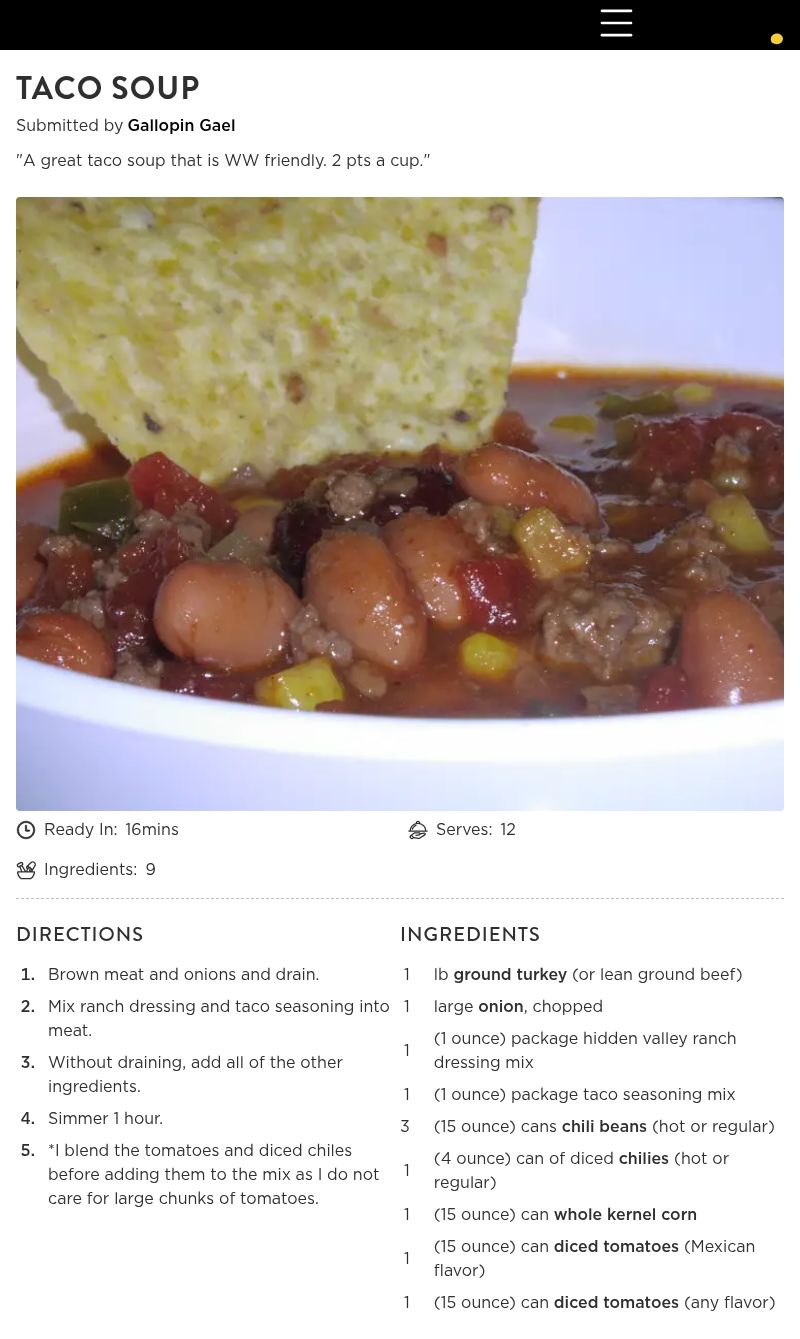 Very good taco soup indeed! I cut it in half for a nice lunch. I had some leftover red kidney beans so threw them in for even more fiber. I thought it could use a tad bit more heat. But we like things hot!! Great flavor, I would never of thought to use ranch dressing mix in this. Thanks for posting this great WW friendly recipe. Made for PAC spring 08'