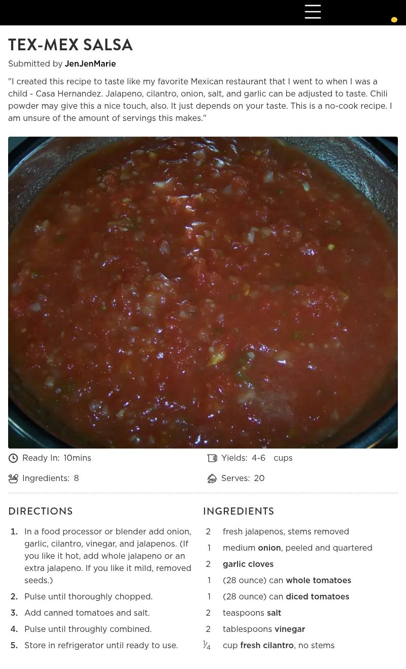 Use two can Rol Tel diced tomatoes with green chilies - drained mild; Original fo more bite One can whole tomatoes One can diced tomatoes 2-3 green onions 2teaspoons minced onions 1 teaspoon salt Place whole tomatoes green onions, garlic and salt into foofprovesdor untill ground together. Add Rol Tel drained and can of un cut tomatoes undrained If rustic style is desired do not add Rot Tel and diced tomatoes till end. Let set in fridge over night for best results