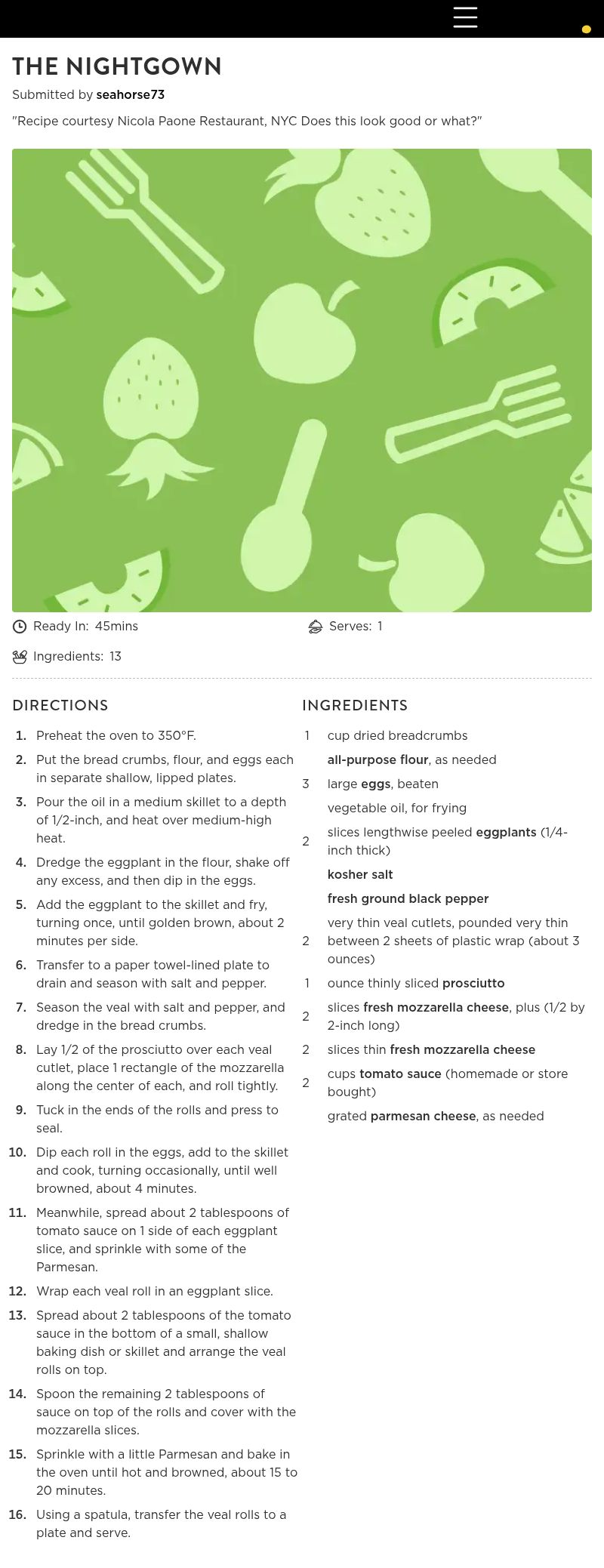 I totally screwed up. The cutlets I got were not good in that they were too small so I didn't roll the veal. I just cooked in olive oil and bread crumbs like cutlets. I ended up making this into a lasagna layering the eggplant, prosciutto, veal and mozz. Came out great. I used Emerils marinara. (I love him)